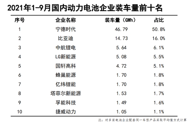 中國汽車動力電池產業創新聯盟數據顯示,今年1-9月,國內動力電池企業裝車量前5名分別為:寧德時代(占比50.8%)、比亞迪(占比16.0%)、中航鋰電(占比6.1%)、LG新能源(占比5.5%)、國軒高科(占比5.1%)。