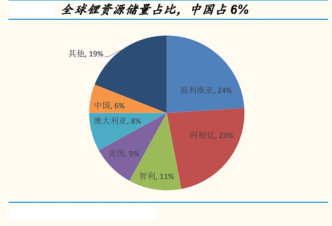 根據美國地質調查局USGS數據,截至2020年末,全球鋰資源量約8600萬噸,其中南美“鋰三角”地區(智利、阿根廷和玻利維亞交界處的高海拔湖泊和鹽沼)的鋰資源量之和約占全球鋰資源總量的近60%。中國目前探明的鋰資源基本為鹵水鋰,儲量占比只有6%。80%的鋰原料依賴進口。