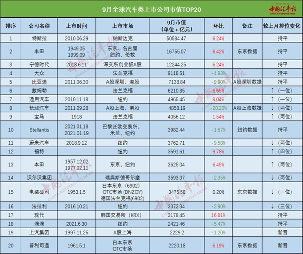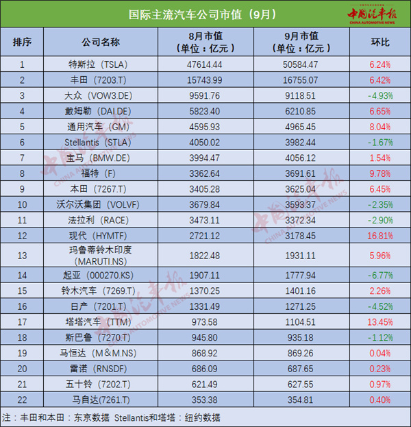 9月,特斯拉、豐田和大眾集團(tuán)依然是國際車企市值圈的“三巨頭”。