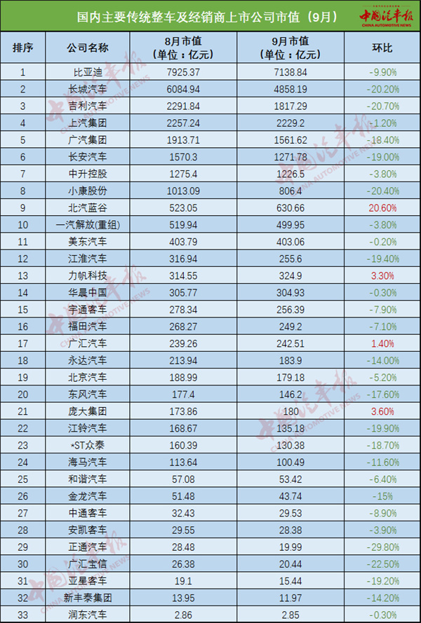 9月國內(nèi)主要傳統(tǒng)整車及經(jīng)銷商上市公司市值表現(xiàn)的亮點之一,是出現(xiàn)2家環(huán)比上升的車企。北汽藍(lán)谷市值達(dá)630.66億元,環(huán)比上升20.6%,上漲幅度位居該類別排名中第一,在股市同行的一片下滑中很是醒目。9月26日,北汽藍(lán)谷發(fā)布公告稱,子公司北汽新能源與華為簽署全面業(yè)務(wù)深化合作協(xié)議,共同打造“ARCFOX”和“HI”聯(lián)合品牌。雙方就營銷渠道共享制定細(xì)化方案并實施,計劃于今年底前實現(xiàn)極狐阿爾法S(HI版)的線上線下渠道銷售合作。由此引發(fā)業(yè)內(nèi)推測,極狐有可能成為繼賽力斯之后,第二家進(jìn)駐華為線下門店的汽車品牌。于是,9月27日開盤,北汽藍(lán)谷在連續(xù)兩周跌幅達(dá)15.66%后一字漲停,此后也延續(xù)升勢。而另一家市值環(huán)比上升的企業(yè)是力帆科技,其9月市值達(dá)324.9億元,繼上月環(huán)比上漲49.7%后,再次環(huán)比上升3.3%。9月22日,首批100輛力帆楓葉80V換電出租車正式交付運營。從當(dāng)日起,其連續(xù)四天股價呈現(xiàn)較大幅度上漲。經(jīng)歷重整,成功引入戰(zhàn)略投資者和產(chǎn)業(yè)投資人后,力帆科技正逐步煥發(fā)新生。