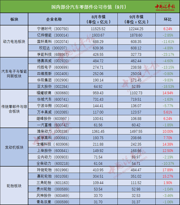相比于8月,9月國內(nèi)汽車零部件企業(yè)市值出現(xiàn)普遍回落。其中,動力電池板塊、汽車電子與智能網(wǎng)聯(lián)板塊市值跌幅明顯。傳統(tǒng)零部件與綜合板塊、輪胎板塊經(jīng)歷了此前的市值增長之后,也開始出現(xiàn)回落苗頭。
