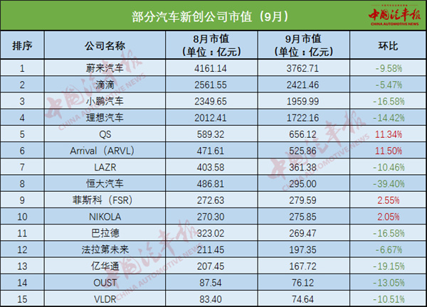 在8月經(jīng)歷交付嚴(yán)重下滑的情況后,蔚來汽車在 9月迎來高光時刻,交付10628輛電動汽車,同比增長125.7%,重回造車新勢力月銷排名第一位。銷量增長并沒有給蔚來汽車的市值起到良好的支撐作用,9月份,蔚來汽車的市值反而下降了9.58%,為3762.7億元。