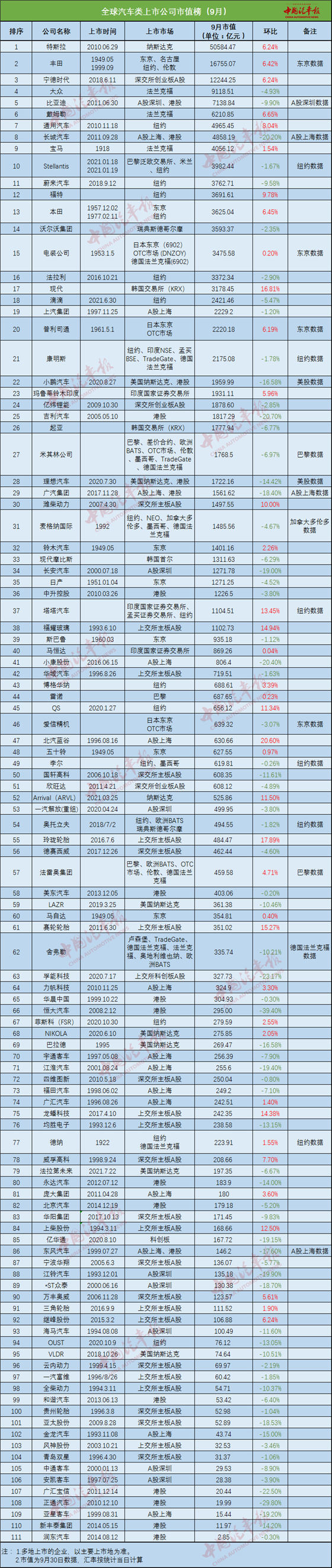 近期,中國汽車報汽車市值研究組在上月首次發(fā)布研究報告(8月)的基礎(chǔ)上,繼續(xù)對全球汽車類上市公司進(jìn)行了月度市值變化跟蹤,并針對2021年9月全球汽車產(chǎn)業(yè)鏈各細(xì)分領(lǐng)域、典型企業(yè)的月度市值變化進(jìn)行梳理和分析。9月的汽車市值統(tǒng)計范圍,依舊涵蓋了國際和國內(nèi)上市的主流整車、零部件企業(yè),以及國內(nèi)主要造車新勢力和經(jīng)銷商集團(tuán),共計111家全球汽車類上市公司。