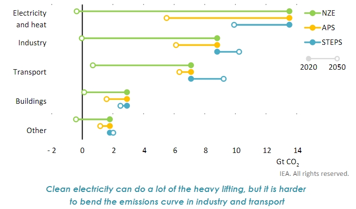 已宣布的凈零承諾和更新的國家確定的貢獻已被完全納入國際能源署新的已宣布的承諾方案。該方案在2030年縮小了既定政策方案(STEPS)和2050年凈零排放方案(NZE)之間不到20%的差距,留下了12Gt二氧化碳的“雄心差距”,需要消除這一差距,使世界在2050年達到凈零排放。包括化石燃料甲烷的排放使差距增加到14 Gt二氧化碳當量。