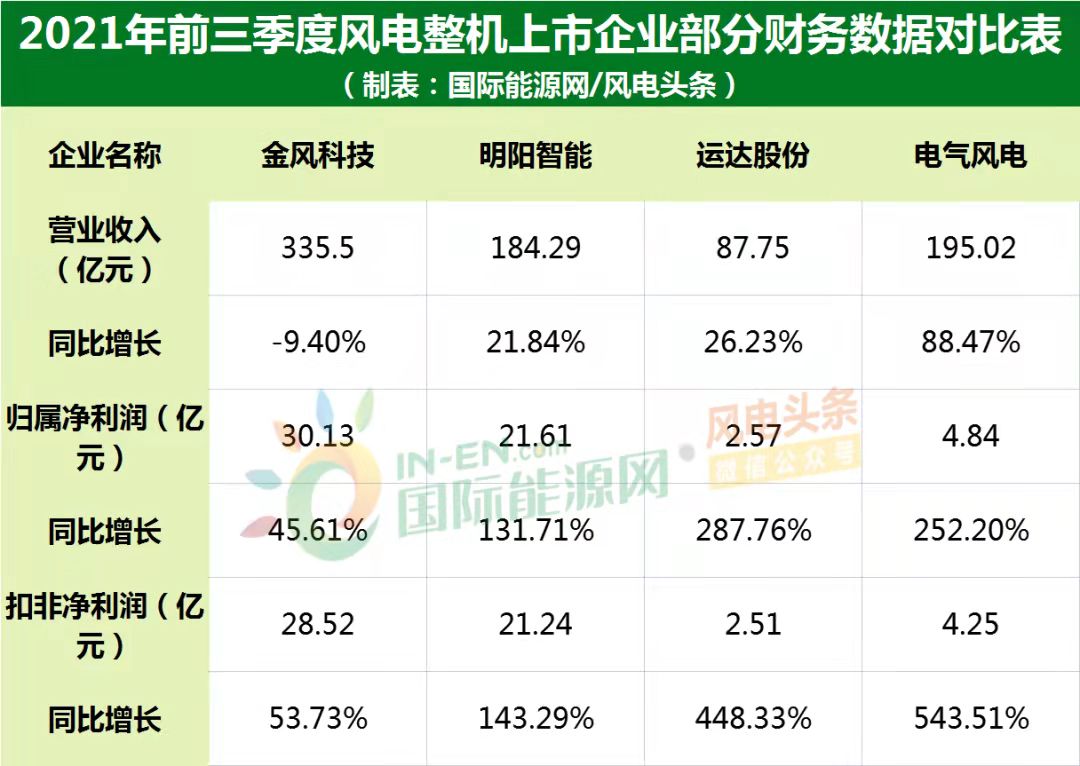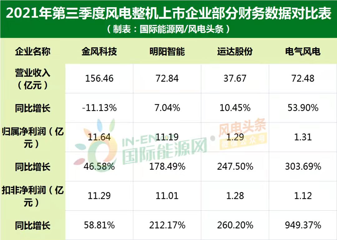 第三季度中,營業收入排名為金風科技、明陽智能、電氣風電、運達股份;扣非凈利潤排名為金風科技、明陽智能、運達股份、電氣風電。