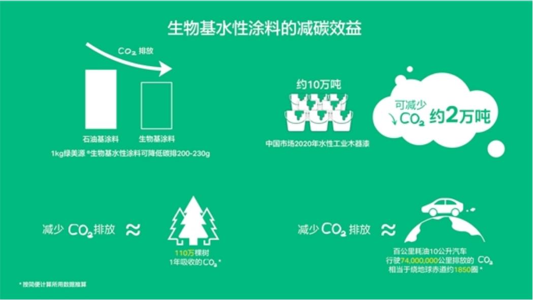 據(jù)推算,使用1公斤綠美源®生物基水性涂料,與石油基水性涂料相比,可減少200-230克碳排放。以2020年的家具市場規(guī)模估算,中國水性工業(yè)木器漆為10萬噸,如果全部采用生物基水性涂料可整體降低碳排放2萬噸,相當(dāng)于約110萬棵樹1年時間吸收的二氧化碳,或約等于一輛百公里耗油10公升的汽車行駛7400萬公里的碳排放量,減碳效果不容小覷。