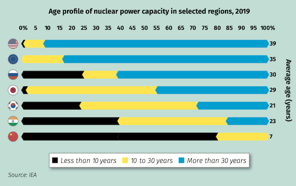 在選定的地區(qū),核電裝機(jī)容量的堆齡概況