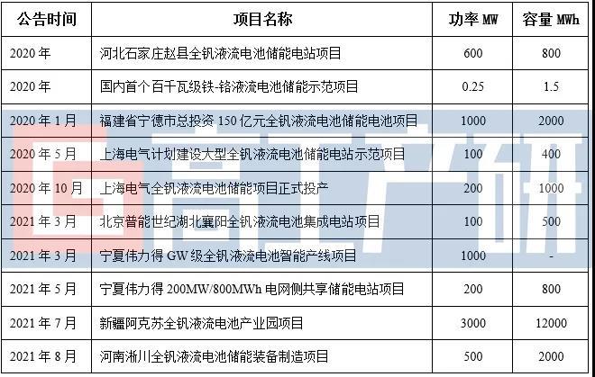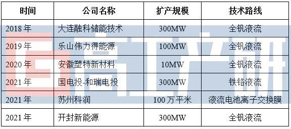 2021年國內主要液流電池產業鏈擴產項目(部分)