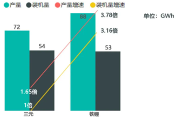 和上個月的情況相似,磷酸鐵鋰在產量和裝機量方面全面超越三元。