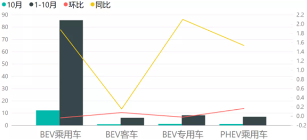 我想從10月和1-10月兩個圖表來看整體的使用情況,10月份最大的用量還是去了純電動乘用車,裝機量為12.219GWh,占比79.26%。而單臺車10-30kWh的插電混動的用量在10月份也達到了1.092GWh,充分反映了這個細分市場的增速,環比也保持了16%的增速。
