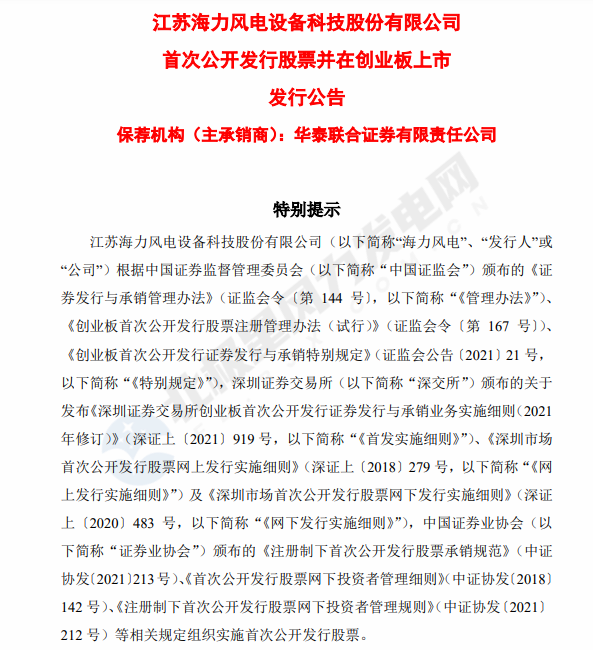 11月11日,江蘇海力風電設備科技股份有限公司(以下簡稱“海力風電”)發布首次公開發行股票并在創業板上市發行公告,本次公開發行股票數量約為5435萬股,發行價格為60.66元/股;2021年11月15日進行網上、網下申購。申購簡稱為海力風電,申購代碼為301155。