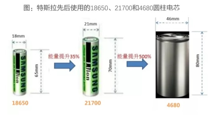 所謂4680,其實(shí)是對電池尺寸的概括(圓柱電池尺寸為直徑46mm,電池高度80mm),以此替代此前特斯拉使用的主流18650電池和21700電池。