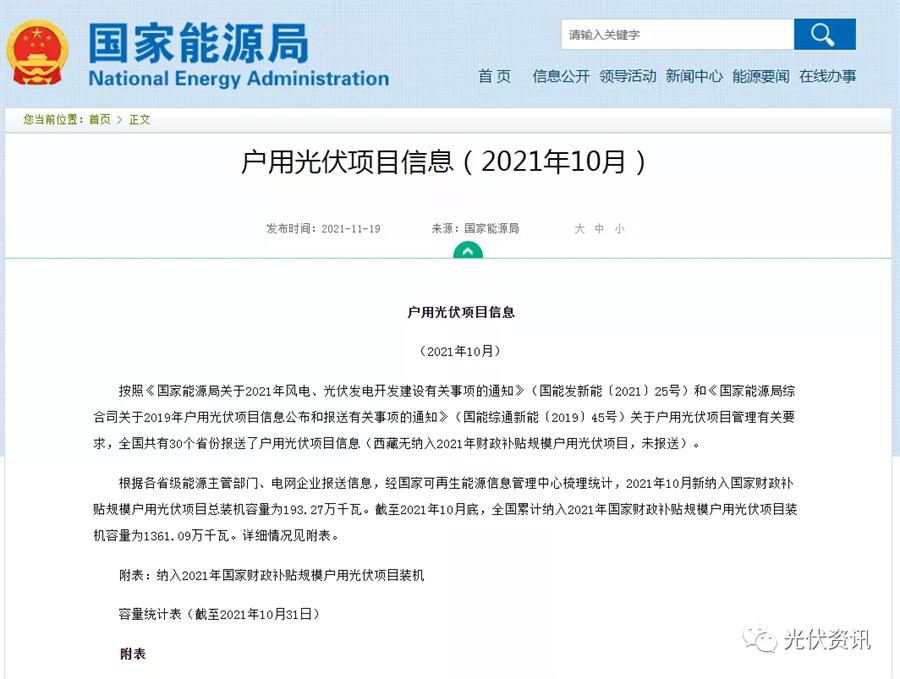 根據(jù)各省級能源主管部門、電網(wǎng)企業(yè)報送信息,經(jīng)國家可再生能源信息管理中心梳理統(tǒng)計,2021年10月新納入國家財政補貼規(guī)模戶用光伏項目總裝機容量為193.27萬千瓦。截至2021年10月底,全國累計納入2021年國家財政補貼規(guī)模戶用光伏項目裝機容量為1361.09萬千瓦。詳細情況見附表。
