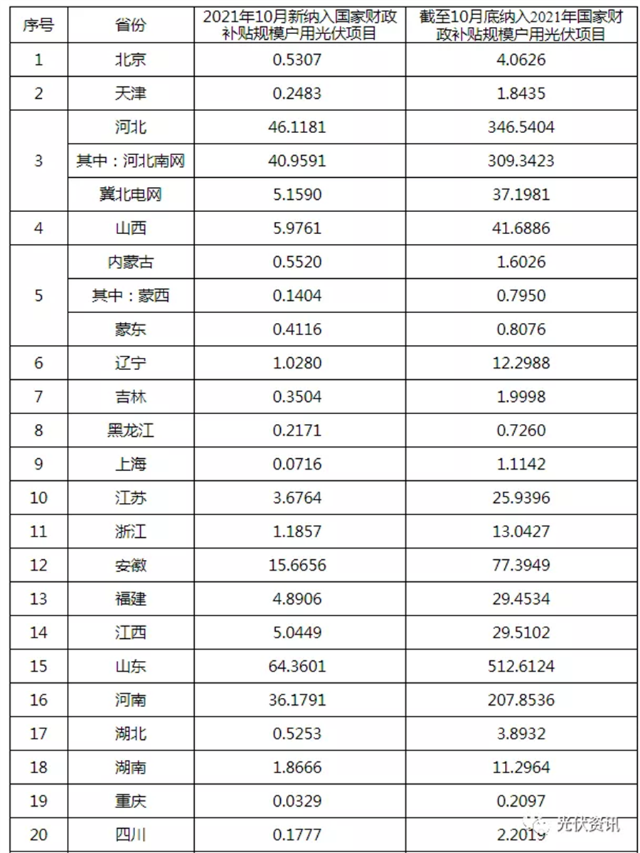 附表:納入2021年國家財政補貼規(guī)模戶用光伏項目裝機容量統(tǒng)計表(截至2021年10月31日)