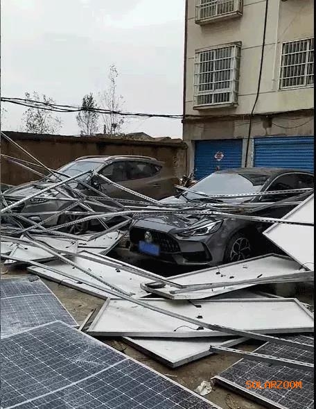 11月7日,湖北襄陽某地分布式光伏電站在大風天氣被吹翻,被吹落的光伏組件幾乎全部被損壞,支架更是嚴重變形,其小區停車位上的車輛受損嚴重。