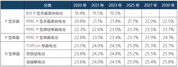 P型電池主要有BSF電池和PERC電池兩種,2015年之前,BSF電池占了總市場的90%,是絕對的主流。2016年之后,PERC電池接棒起跑,到2020年,PERC電池在全球市場中的占比已經(jīng)超過85%,BSF電池淘汰出局。在此期間,電池轉(zhuǎn)換效率從不足20%提升到超過23%。