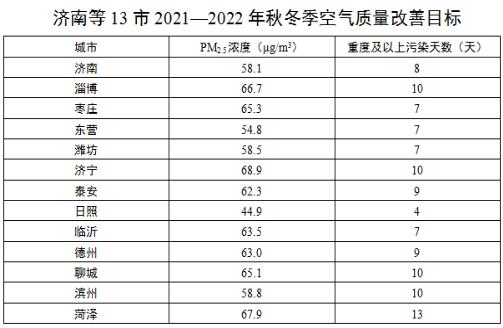 秋冬季期間(2021年10月1日至2022年3月31日),濟(jì)南等13市細(xì)顆粒物(PM2.5)濃度控制目標(biāo)和重度及以上污染天數(shù)控制目標(biāo)見下表,青島、煙臺、威海3市達(dá)到相應(yīng)年度空氣質(zhì)量改善目標(biāo)。