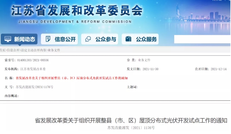 江蘇省發展改革委關于組織開展整縣(市、區)屋頂分布式光伏開發試點工作的通知