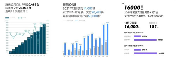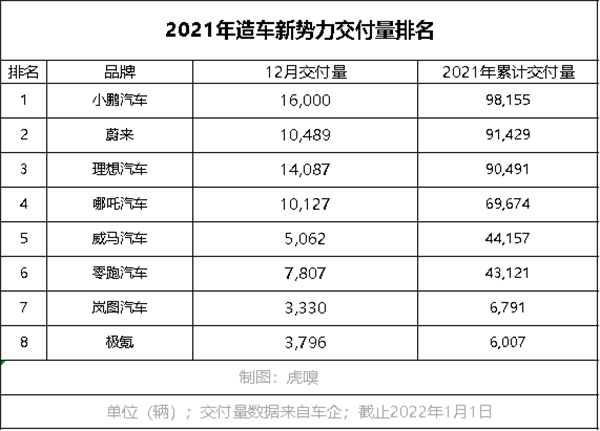 2022年1月1日,造車新勢力相繼公布2021年12月及全年累計(jì)銷量。在12月交付量方面,小鵬汽車以16,000輛的成績,繼續(xù)穩(wěn)坐冠軍位置。其次是理想汽車14,087輛和蔚來的10,489輛。