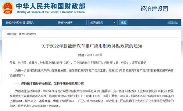 2021年12月31日,財(cái)政部、工信部、科技部、發(fā)展改革委發(fā)布關(guān)于2022年新能源汽車推廣應(yīng)用財(cái)政補(bǔ)貼政策的通知:2022年,新能源汽車補(bǔ)貼標(biāo)準(zhǔn)在2021年基礎(chǔ)上退坡30%;城市公交、道路客運(yùn)、出租(含網(wǎng)約車)、環(huán)衛(wèi)、城市物流配送、郵政快遞、民航機(jī)場以及黨政機(jī)關(guān)公務(wù)領(lǐng)域符合要求的車輛,補(bǔ)貼標(biāo)準(zhǔn)在2021年基礎(chǔ)上退坡20%。