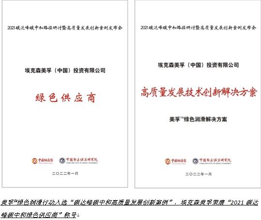 大會期間,"碳達峰碳中和高質量發展創新案例"隆重揭曉。美孚?綠色潤滑行動有幸入選,埃克森美孚也榮膺"2021碳達峰碳中和綠色供應商"稱號。該獎項由中國能源經濟研究院提供學術支持,旨在對先進模式和典型案例進行調研評析和成功經驗總結,促進"碳達峰、碳中和"技術應用創新產業高質量發展。