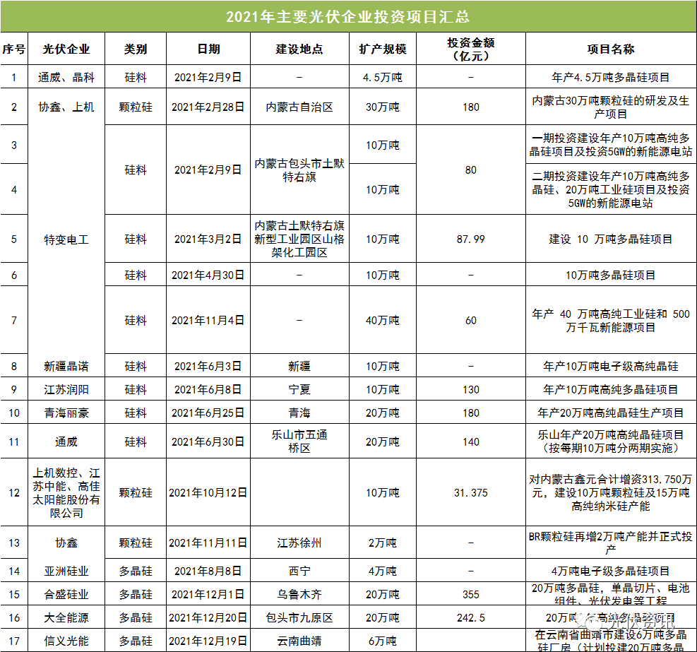 以下是2021年硅料投資詳情: