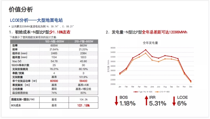 以內蒙某200MW電站為例,Tiger Neo-605W與常規210PERC產品660W對比來看,其BOS成本可降低1.18%左右,度電成本下降6%,IIR可提高5.31%。叢秋實表示,目前主流支架廠家、逆變器廠家的相關產品已經可以全面適配以N型組件構建的光伏系統。