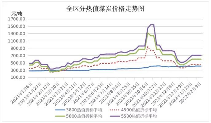 隨著煤炭產量持續增加,本周內蒙古煤炭價格小幅回落。2月16日,全區動力煤平均坑口價格為419.57元/噸,與2月第二周相比(下稱環比)價格略降0.17%,與2021年2月第三周相比(下稱同比)上漲41.74%。其中,東部地區褐煤平均坑口價格為361.71元/噸,環比持平,同比上漲39.72%;鄂爾多斯地區動力煤平均坑口價格595.00元/噸,環比略降0.21%,同比上漲51.11%。分熱值來看,3800、4500、5000、5500熱值動力煤坑口平均折標價格分別為每噸409.00元、460.33元、600.00元、700.00元,環比,3800、5500熱值動力煤價格分別下降0.46%、0.71%,4500、5000熱值動力煤價格均持平,同比,3800、4500、5000、5500熱值動力煤價格分別上漲41.39%、35.26%、50.00%、55.56%。