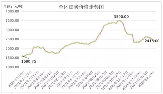 受需求低迷影響,本周內蒙古焦炭價格繼續下降。2月16日,全區焦炭平均出廠價格為2416.00元/噸,環比下降2.03%,同比上漲17.44%。