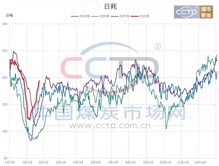 目前,下游電廠采購需求陸續增多,港口市場情緒升溫,市場活躍度提升,2月底前,國內大部地區氣溫偏低,尤其華南沿海地區低溫偏低明顯,日耗表現強勢,而進口煤優勢不再,國內煤成為拉運重點。