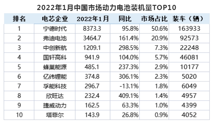 今年1月份,中國市場裝機量排名前10家企業分別為寧德時代、弗迪電池、中創新航、國軒高科、蜂巢能源、億緯鋰能、孚能科技、欣旺達、捷威動力和塔菲爾。