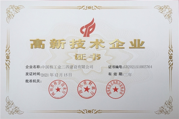 中核二四獲得國家高新技術(shù)企業(yè)證書