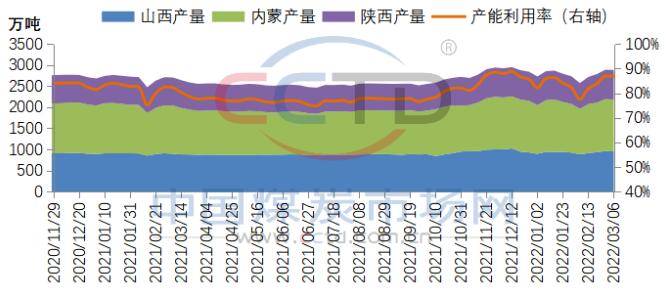 國內(nèi)產(chǎn)地產(chǎn)銷保持高位。根據(jù)CCTD中國煤炭市場網(wǎng)監(jiān)測的數(shù)據(jù)顯示,3月6日當周,晉陜蒙442家煤礦產(chǎn)量合計2886萬噸,產(chǎn)能利用率86.9%,產(chǎn)量環(huán)比基本持平,同比增長6.6%。陜西、山西周產(chǎn)量均創(chuàng)今年新高。本周下游拉運也較為積極,同時由于疫情管控加嚴,運費上漲。榆林地區(qū)在產(chǎn)煤礦整體銷售情況良好,基本保持產(chǎn)銷平衡狀態(tài);受產(chǎn)地發(fā)運至港口利潤較好影響,鄂爾多斯地區(qū)煤炭銷售發(fā)運積極。