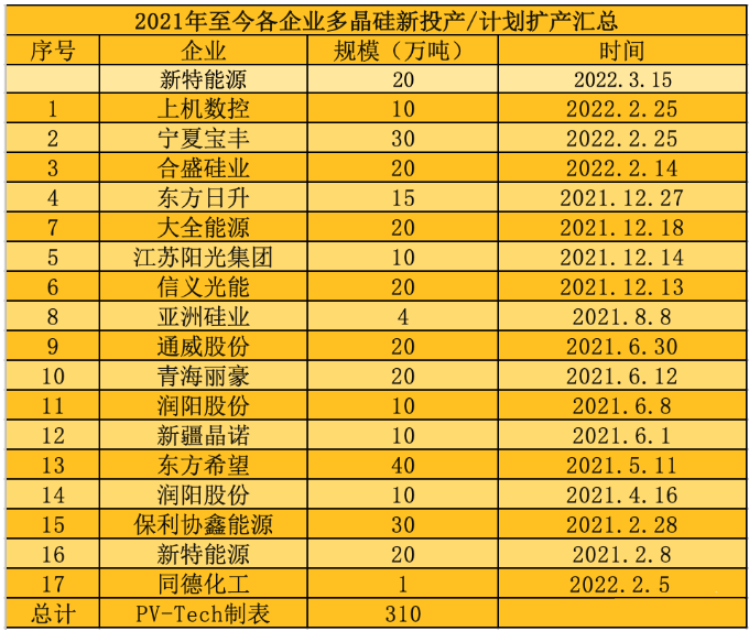 據PV-Tech不完全統計,2021年至今,國內約有17家公司宣布多晶硅新投產及擴產計劃,硅料總規模達310萬噸,總投資已超過2500億元: