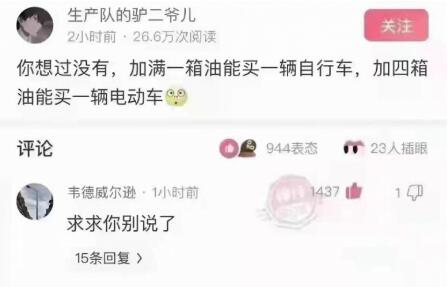 更有網友算了一筆賬,說現在加滿一箱油能買一輛自行車,加滿四箱油能買一輛電動車,簡直是在倒逼車主們綠色出行。