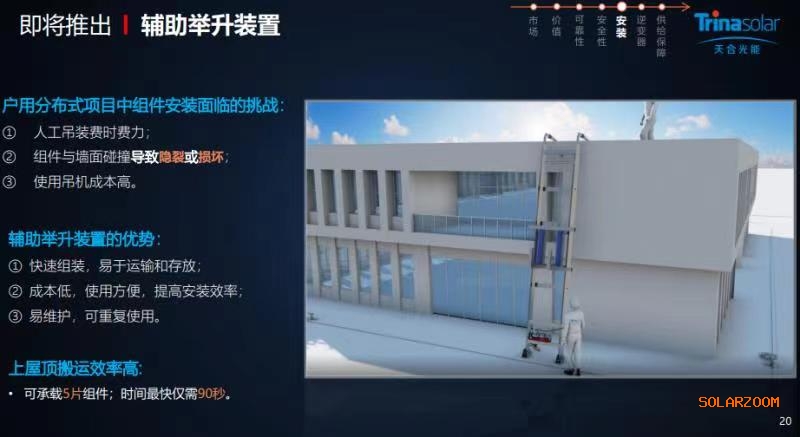 同期,天合光能還發(fā)布針對(duì)分布式施工研發(fā)的輔助舉升設(shè)備和快捷安裝解決方案,組件安裝施工過程可縮短40%時(shí)間!每一分錢的節(jié)省、每一分鐘工期的縮短,對(duì)項(xiàng)目投資都有重要意義,也將助推分布式光伏整縣推進(jìn)的快速進(jìn)行。