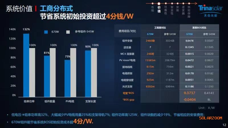 由于組件功率提升,安裝塊數(shù)減少,使得600W+在工商分布式場(chǎng)景下,至尊670W組件對(duì)比參考545W組件,節(jié)省系統(tǒng)初始投資成本超4分錢/W。670W組件組串功率更高,大幅減少PV電纜用量和支架導(dǎo)軌,組件塊數(shù)的減少也相對(duì)節(jié)省了安裝費(fèi)用,這一成本節(jié)省甚至高達(dá)1毛錢/W。這將成為低碳化、能耗雙控、綠電交易下,又一激發(fā)業(yè)主選擇超高功率組件的關(guān)鍵原因。