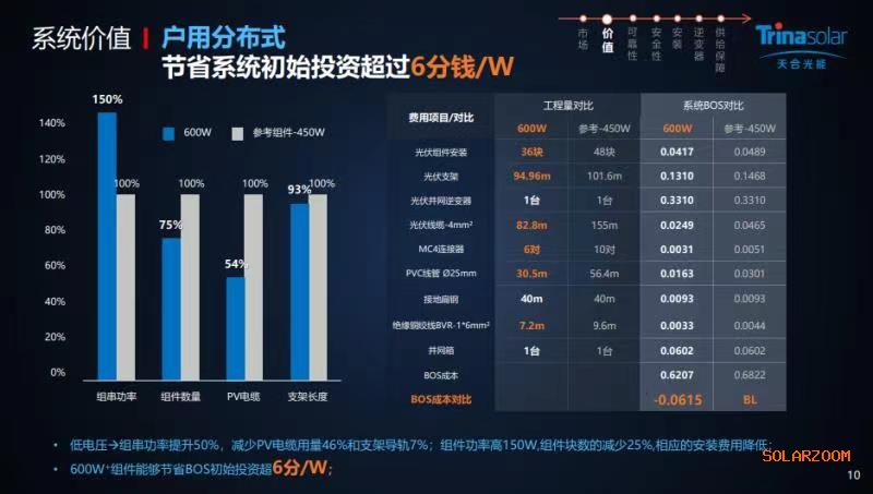 此外,經(jīng)過全方位實(shí)證案例及第三方測(cè)試,600W+組件在分布式的應(yīng)用價(jià)值十分顯著。600W+組件在戶用租賃模式下,典型常見屋頂可以節(jié)省系統(tǒng)初始投資超過6分錢/W,而且由于組件功率提升,安裝塊數(shù)減少,在新一代超高功率組件中系統(tǒng)價(jià)值全面勝出。