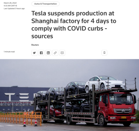 才恢復生產十天,特斯拉上海工廠再次面臨停產。據路透社報道,受上海防疫政策影響,特斯拉將于今日(3月28日)起暫停上海工廠生產活動,停產時間將持續4天,此消息已通知工人和供應商。