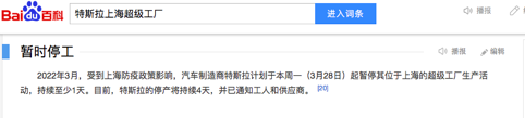 隨后汽車行業關注注意到,該消息發布沒多久,“特斯拉上海工廠暫時停工”的消息便出現在百度詞條上。