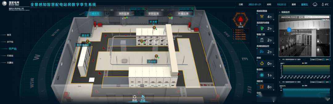 使用數字孿生技術以立體三維方式展示站房的不同區(qū)域溫濕度、火災煙霧告警、燈控、視頻和其它預設位信息等,全方位直觀展示站房的運行環(huán)境,監(jiān)測信息一目了然。