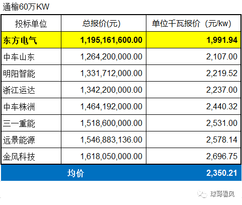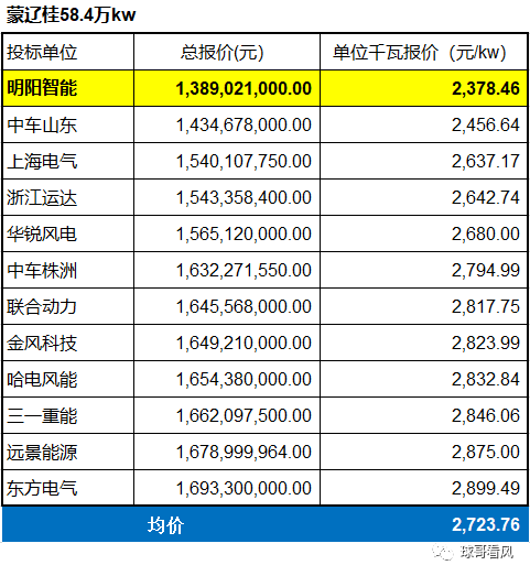 本輪華能項目的總體均價為2336元/kw,6個標(biāo)噸最低均價為科爾沁前旗標(biāo)段,均價2036元/kw,最高均價為蒙遼桂標(biāo)段,均價高達(dá)2723元/kw。