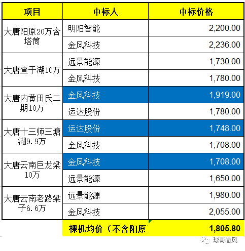 從機(jī)型分析,蒙遼桂標(biāo)段的機(jī)型基本最高4.5MW,基本都是4MW左右機(jī)型,所以價格略高,按4MW設(shè)計,塔筒價格500元/kw,裸機(jī)就回復(fù)了2200元/kw的水平。