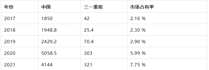 2021年,三一重能在中國陸上風電市場占有率為7.75%,同比去年增長1.76個百分點。近5年,三一重能在中國陸上風電市場占有率逐年穩(wěn)步攀升,2020年實現(xiàn)跨越式騰飛,2021年市場占有率創(chuàng)歷史新高。