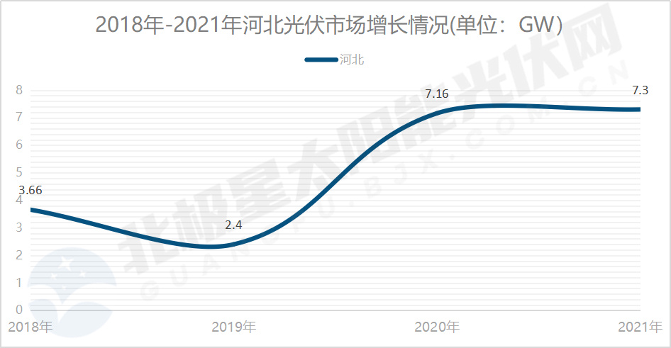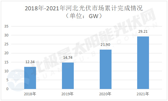 河北省光伏資源豐富,已成為光伏發(fā)展的重點(diǎn)省份之一。據(jù)國家能源局統(tǒng)計數(shù)據(jù)顯示,2018年,光伏累計裝機(jī)達(dá)到12.34GW;2020年21.9GW,2021年29.21GW,3年增長1.37倍。目前,河北光伏裝機(jī)總?cè)萘績H次于山東。
