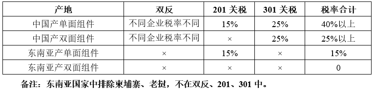 當(dāng)前,美國對(duì)中國光伏組件征收三種額外的關(guān)稅:反傾銷與反補(bǔ)貼稅,簡稱:雙反稅,每年都要復(fù)審,各企業(yè)不相同;201稅,雙玻組件豁免,不用交201稅,單面組件暫時(shí)交15%,明年到期后再談;301稅,稅率為25%;上述三種稅收疊加征收,當(dāng)前的總稅率在40%+,具體如下表所示。