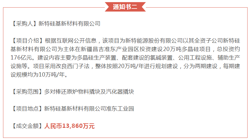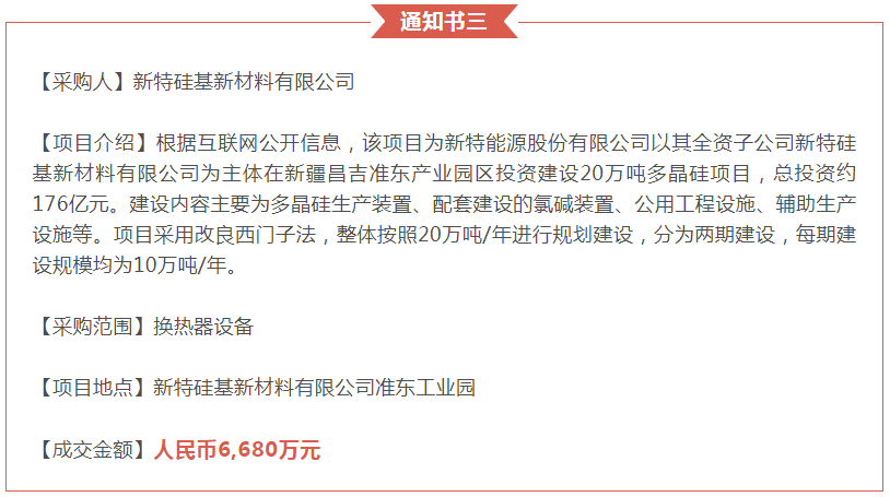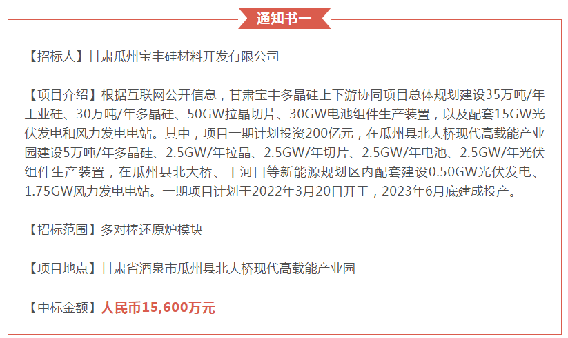 5月11日晚間,雙良節(jié)能發(fā)布公告,公司控股子公司江蘇雙良新能源裝備近期收到甘肅瓜州寶豐硅材料開發(fā)有限公司送達(dá)的《中標(biāo)通知書》及新特能源股份有限公司送達(dá)的《預(yù)成交通知書》,本次中標(biāo)標(biāo)的為還原爐撬塊及換熱器設(shè)備,總中標(biāo)金額為36,140萬元。