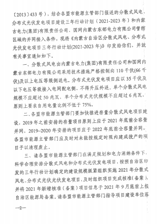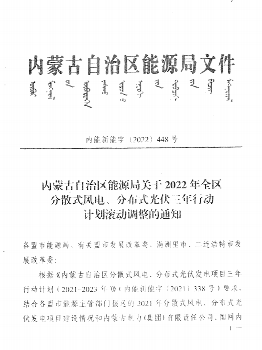 近日,內蒙古自治區能源局發布《關于2022年全區分散式風電、分布式光伏三年行動計劃滾動調整的通知》,提出: