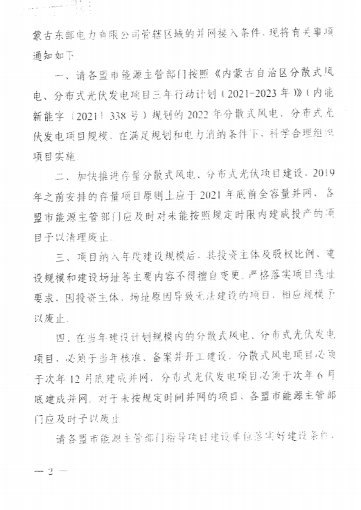 1)加快推進存量分散式風電、分布式光伏項目建設、2019年之前安排的存量項目原則上應用2021年底前全容量并網、各盟市能源主管部門應及時對未能按照規定時限內建成投產的項目予以清理廢止。