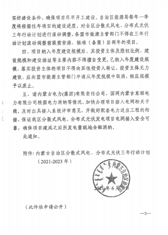 3)在當年建設計劃規模內的分散式風電、分布式光伏發電項目必須于當年核準、備案并開工建設,分散式風電項目必須于次年12月底建成并網,分布式光伏發電項目必須于次年6月底建成并網,對于未按規定時間并網的項目,各盟市能源主管部門應即使予以廢止。